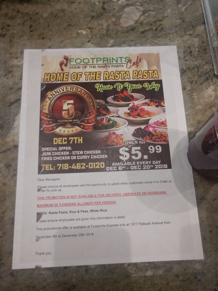 Introducing Footprints Cafe, a Caribbean gem located at 1377 Flatbush Ave in Brooklyn. This restaurant offers a variety of dishes with options for delivery, takeout, and reservations. It's a casual spot with a moderate noise level, perfect for lunch, dinner, or late-night cravings. The menu boasts flavorful options like crab cakes, Rasta pasta with oxtails, curry chicken, and sea moss. Customers rave about the efficient service and consistent quality of the food. Whether you're a fan of spicy dishes or exotic flavors, Footprints Cafe has something for everyone. Don't miss out on their signature dishes like stew chicken with Rasta pasta or the mouthwatering curry goat. Plan a visit to enjoy a delicious meal in a vibrant Caribbean setting.